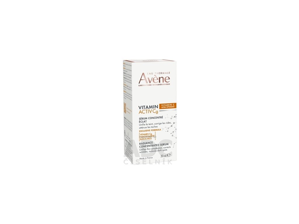 Starnutie buniek vedie k postupnému zhoršovaniu funkcie tkanív. Dôsledkom je výskyt klinických príznakov na úrovni kože, ako sú suchosť, pigmentácia, ochabnutosť a vrásky. Dermatologické laboratóriá Avène vytvorili korekčné sérum na rozjasnenie pleti, ktoré obsahuje 3 dermatologicky účinné látky: [VITAMÍN Cg*] 1,8 %: známy pre svoj antioxidačný účinok, zodpovedá 20 % vitamínu C** [NIACINAMID] 3 %: dlhodobo regeneruje pleť a redukuje výskyt škvŕn [BAKUCHIOL] 1,5 %: uznávaný ako rastlinná alternatíva retinolu, koriguje vrásky. Vďaka vzájomne sa doplňujúcej kombinácii účinných látok poskytuje toto sérum okamžitý rozjasňujúci efekt. Okamžite: pleť len žiari***. Po 15 dňoch: pleť je vyhladená*** a vypnutá 95 %****. Po 1 mesiaci: tmavé škvrny sú redukované*****. Vitamín Activ Cg korekčné sérum na rozjasnenie pleti je prípravok testovaný na citlivej pleti, obsahuje 94 % zložiek prírodného pôvodu, bez zložiek živočíšneho pôvodu.