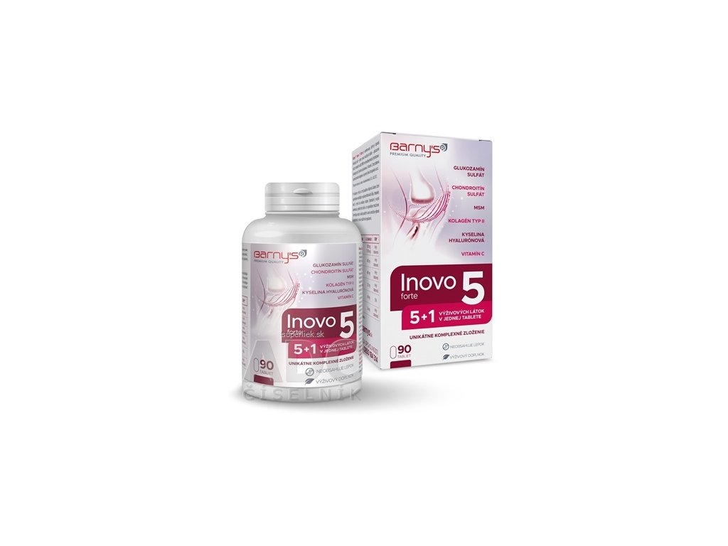 Barny´s Inovo 5 forte je kombinovaný vitamínovo-živočíšny výživový doplnok obsahujúci päť vysokokvalitných zložiek – glukózamín sulfát, chondroitín sulfát, MSM, kolagén II. typu a kyselinu hyalurónovú a vitamín C, ktorý prispieva k prirodzenej funkcii chrupaviek a kostí.
