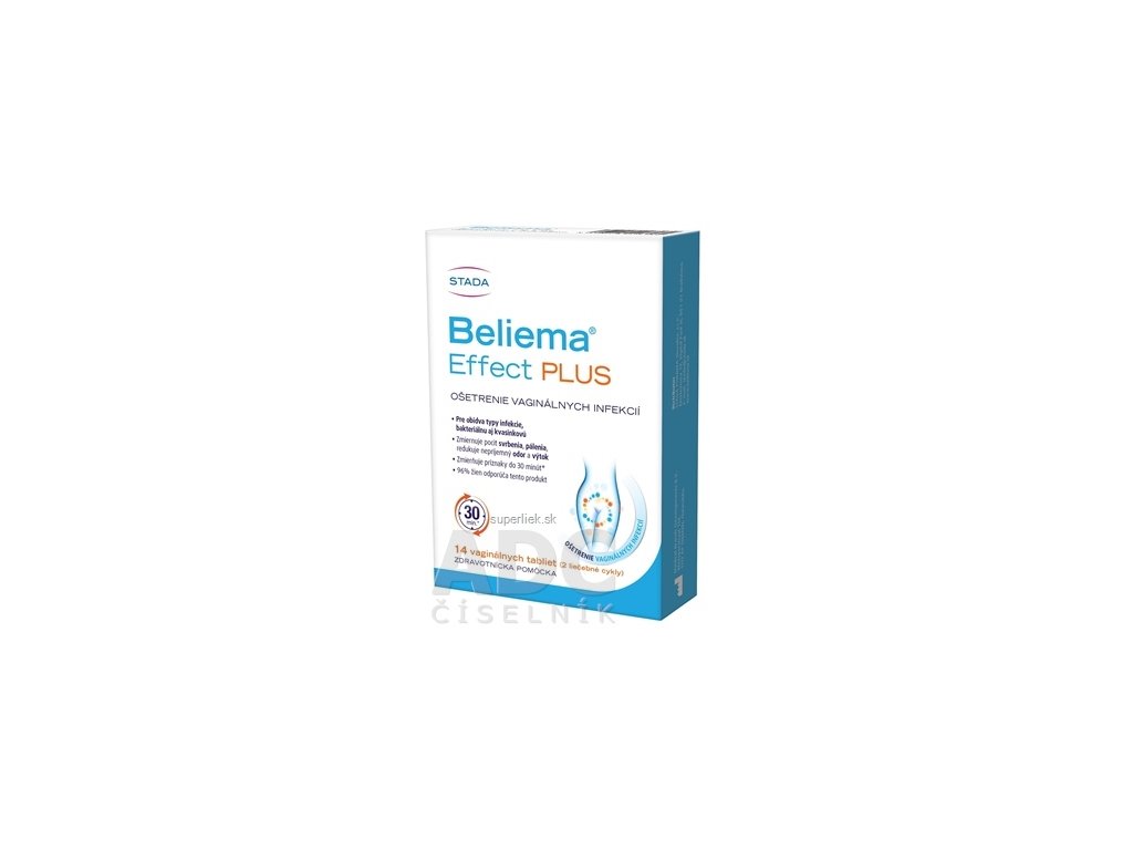 Beliema® Effect PLUS je zdravotnícka pomôcka na samoošetrenie vaginálnych infekcií založená na kyseline hyalurónovej a laktitol monohydráte. Je určená na ošetrenie vaginálnych infekcií spôsobených baktériami aj kvasinkami. Malé tvrdé tablety sa vkladajú hlboko do pošvy s cieľom obnoviť a udržať prirodzenú vaginálnu flóru a zdravé vaginálne pH.