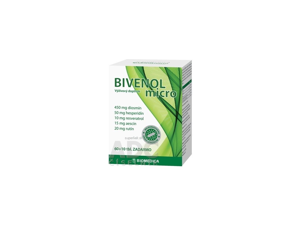 Výživový doplnok Bivenol micro obsahuje mikonizovanú zmes diosmínu a hesperidínu. Mikronizácia diosmínu a hesperidínu zvyšuje vstrebateľnosť a využitie týchto látok. Ďalej obsahuje rutín, extrakt pagaštanu konského (min. 20% aescínu) a resveratrol z pohánkovca japonského ako antioxidant a pre normálnu činnosť kardiovaskulárneho systému.