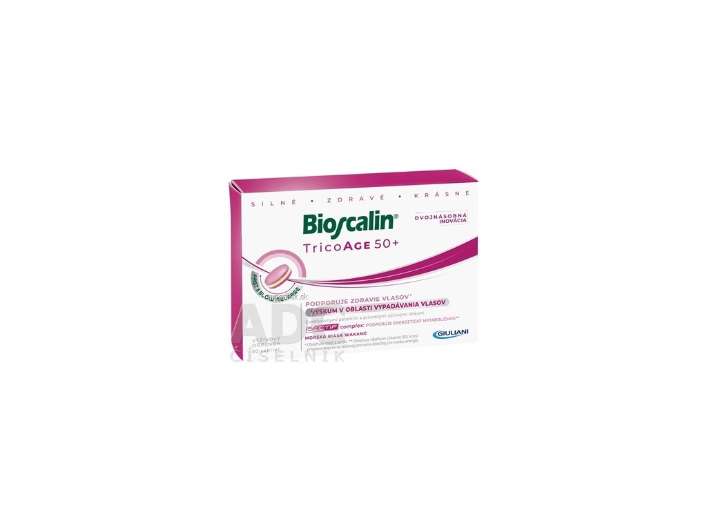 Výživový doplnok Bioscalin® TricoAGE 50+ je špeciálne vyvinutý v laboratóriách spoločnosti Giuliani, skúmajúcich vypadávanie vlasov, na doplnenie dôležitých živín pre energetický metabolizmus (riboflavín) a pre ich výživu a krásu. Zloženie je doplnené o vitamín D a sóju ktorá je zdrojom izoflavónov.