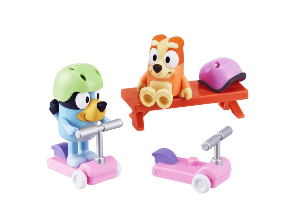 Set obsahuje detaily a prvky, ktoré verne zachytávajú štýl a atmosféru z obľúbeného seriálu. Bluey a Bingo sú oblečené do špeciálnych odevov a sú pripravené na dobrodružstvo na skútroch.