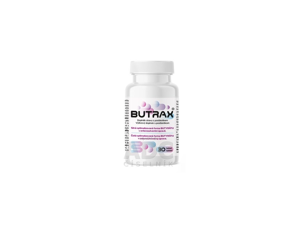 Výživový doplnok Butrax® je určený pre doplnenie postbiotika butyrátu. Butyrát predstavuje elementárnu krátko reťazcovú mastnú kyselinu (SCFA). Je produkovaná hlavne baktériami fermentujúcimi vlákninu v čreve a jeho množstvo môže byť znížené pri nerovnováhe črevnej mikrobioty. Enterosolventná úprava chráni butyrát pred nízkým pH v žalúdku a zaisťuje jeho presun do čreva.