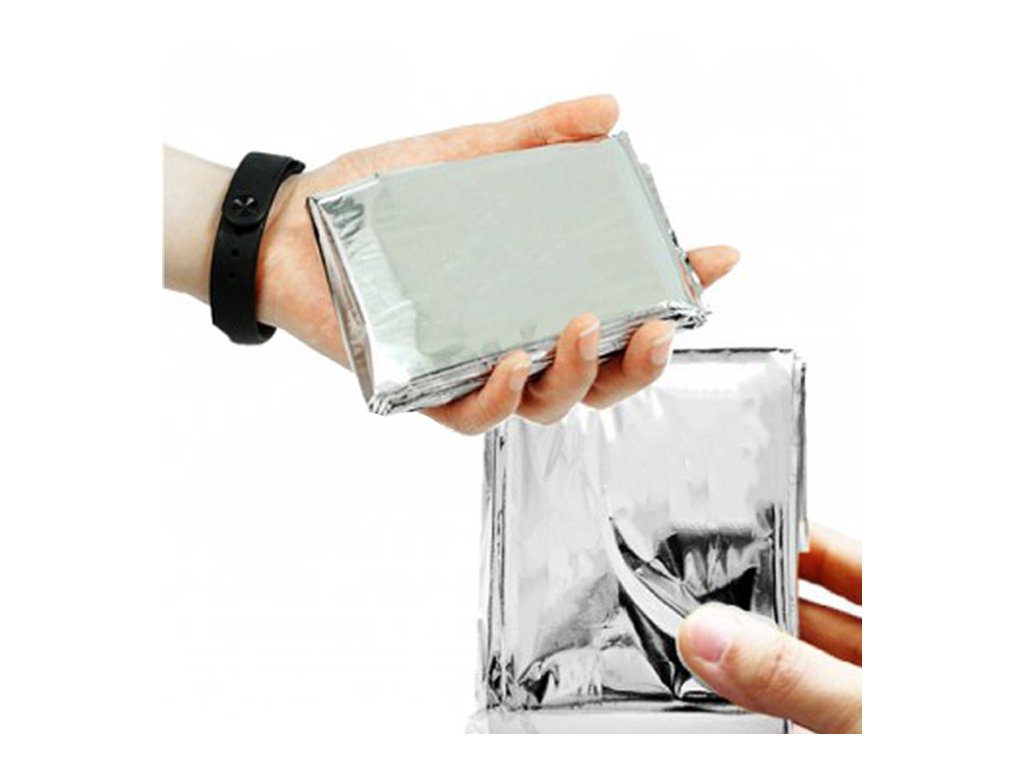 Technický popis: Pohotovostná prikrývka, pozostávajúca z dvoch vrstiev metalizovanej striebornej PET fólie s hrúbkou 12 μm, je odolná proti roztrhnutiu a vodeodolná.