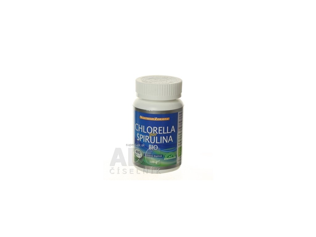 Výživový doplnok CHLORELLA plus SPIRULINA BIO je zmes chlorely a spiruliny obsahujúca vitamíny, minerály, bielkoviny, aktívne enzýmy a chlorofyl.