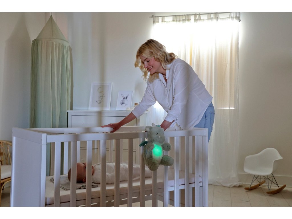 S 8 upokojujúcimi zvukmi a melódiami, z ktorých si môžete vybrať, bude vaše dieťa prenesené do ríše snov jediným stlačením tlačidla! Drak má aj suchý zips, vďaka ktorému najnovšieho parťáka bábätka jednoducho pripevníte na každú postieľku. A keď sa srnček potrebuje okúpať, odstráňte reproduktor a hoďte maskota do bielizne.