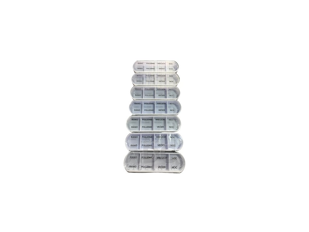 Praktický organizér na ukladanie tabletiek so samostatným puzdrom na každý deň v týždni. V každom puzdre sú 4 priehradky, vďaka ktorým je možné presne naplánovať dávkovanie lieku 4x denne: ráno, popoludní, večer, v noci. Viac o produkte na adc.sk