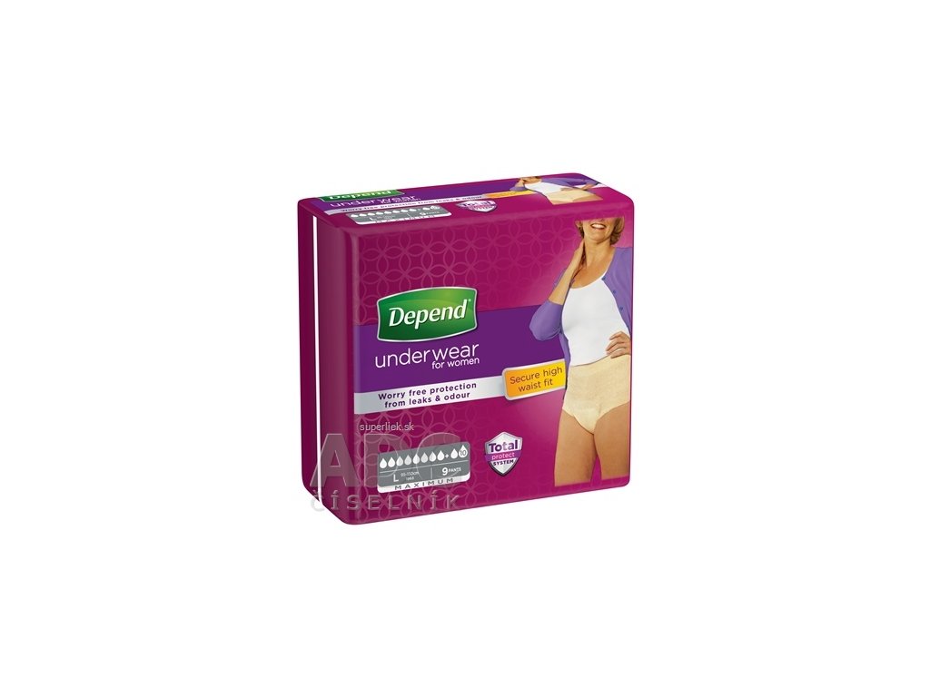 DEPEND MAXIMUM L pre ženy naťahovacie nohavičky, obvod bokov 95-130 cm, priedušné, 1x9 ks