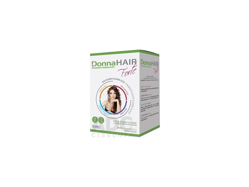 Darčekové balenie, výživový doplnok DonnaHAIR FORTE. Jediná tobolka prípravku obsahuje zvýšenú dávku aminokyselín, ktoré sú pre štruktúru vlasu kľúčové. Vďaka tomu je dosiahnutý rýchlejší nástup účinku, pôsobenie prípravku je dlhodobejšie a výsledná kvalita vlasov viditeľne lepšia.