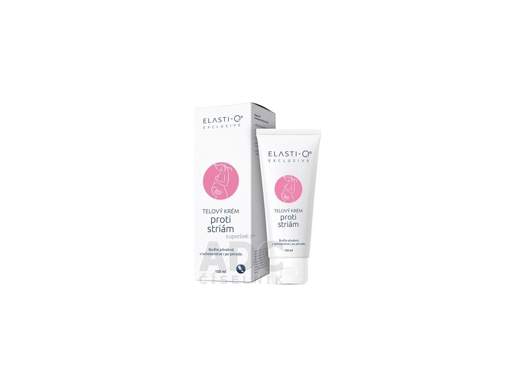Elasti-Q Exclusive telový krém s novým, účinnejším zložením, určený pre ženy v období počas a po tehotenstve ako prevencia proti striám. Telový krém pôsobí nie len v oblasti brucha, ale tiež stehien, bokov a v ďalších problematických partiách. Obsahuje účinné látky: Elastin, D-Panthenol, Kyselinu hyaluronovú, Vitamín E, Extrakt Pupočníka ázijského (Centella Asiatica) a Kozinca (Astragalus Gumifer Root). Prípravok: