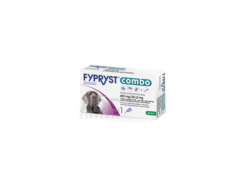 FYPRYST combo 402 mg/361,8 mg roztok na nakvapkanie na kožu pre veľmi veľké psy (nad 40 kg). Obsahuje kombináciu dvoch účinných látok: fipronilu a metoprenemu. Roztok sa nachádza v pipetách, pričom každá pipeta obsahuje: