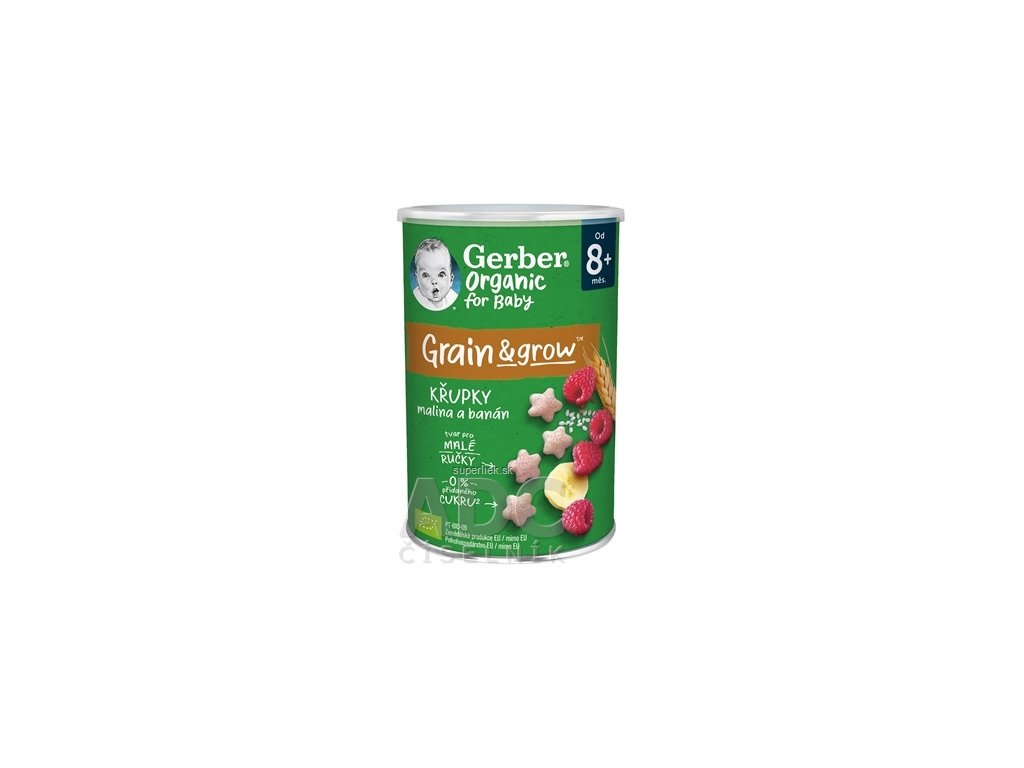 GERBER Organic chrumky s malinami a banánom sú krehké a nadýchané chrumky pre deti vhodné od ukončeného 8. mesiaca. Chrumky sú špeciálne navrhnuté tak, aby zodpovedali potrebám vašich ratolestí. Skvele padnú do rúčok malých stravníkov a nabáda aj tie najmenšie k samostatnosti pri jedle. Hravý tvar skvele padnúci do malých rúčok vedie k rozvoju jemnej motoriky.