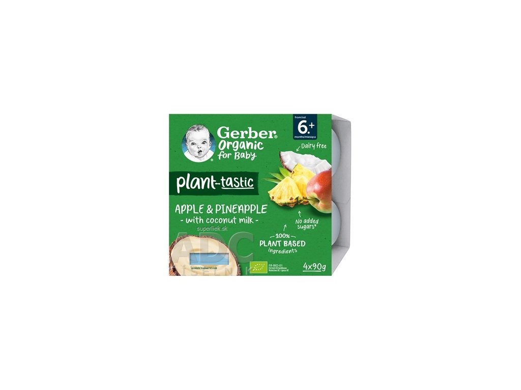 GERBER Organic 100% rastlinný dezert jablko ananás s kokosovým mliekom. BIO ovocná desiata. Od ukončeného 6. mesiaca. Pasterizované. Balené v ochrannej atmosfére.