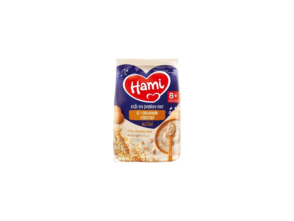 Potravina na báze obilia určená pre dojčatá a malé deti od ukončeného 8. mesiaca, v prášku. Jedna porcia kaše denne tak pomáha postupne zavádzať nové chute obilnín či ovocia a vytvárať zdravé stravovacie návyky. Hami mliečna kaša so 7 obilninami piškótová bez pridaného cukru (obsahuje prírodné cukry) je vhodná na večeru.