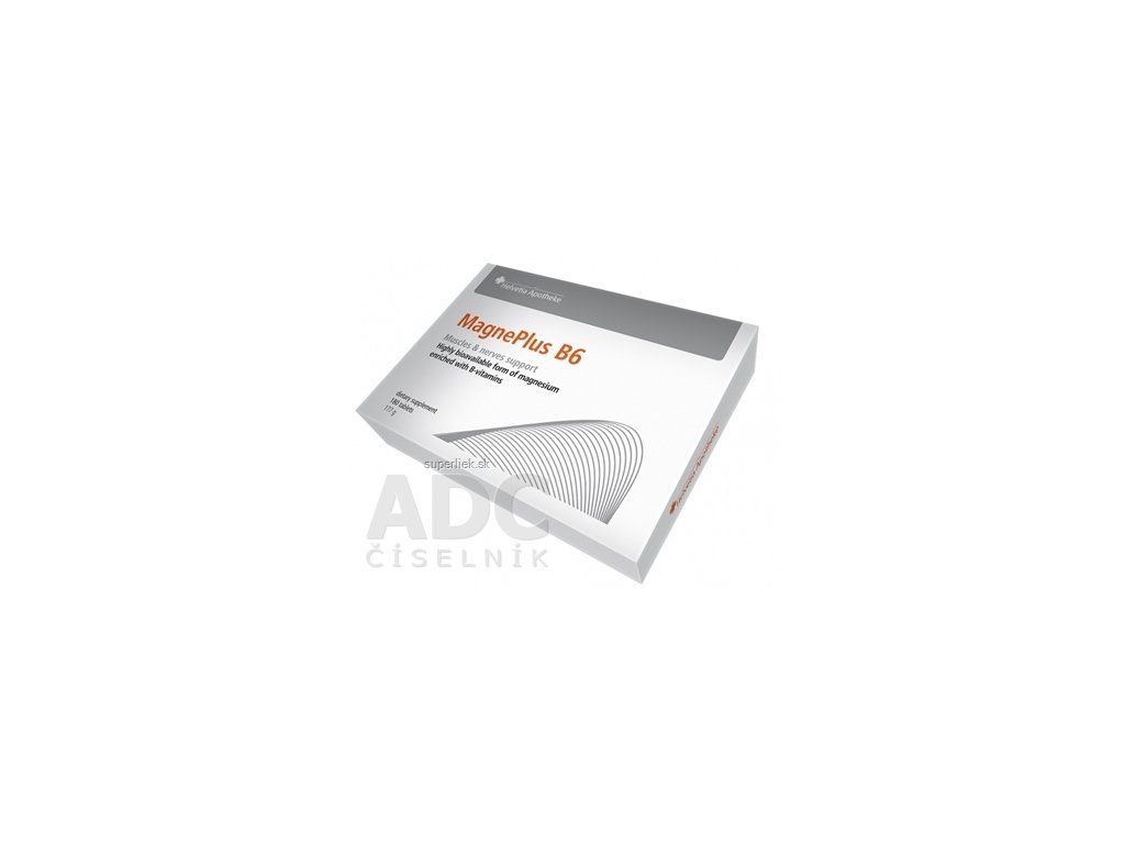 Charakteristika: MagnePlus B6 je výživový doplnok, ktorý obsahuje horčík a komplex vitamínov typu B. Prípravok je vhodný na doplnenie horčíka, ktorý prispieva k správnej činnosti nervovej sústavy a svalov, k zníženiu miery únavy a vyčerpania, priaznivo ovplyvňuje stav kostí a zubov.