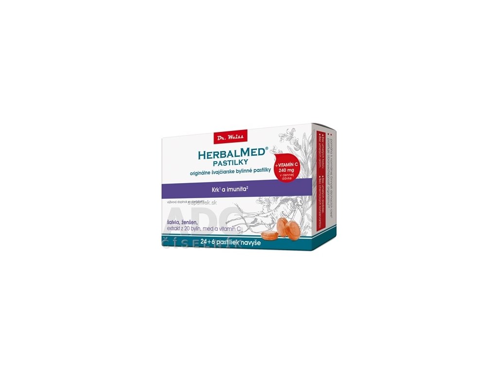 HERBALMED® pastilky Dr. Weiss – Originálne švajčiarske bylinné pastilky sa vyrábajú podľa pôvodnej receptúry vo Švajčiarsku. Účinnosť a jedinečnosť zaručuje starostlivo kontrolovaná kvalita a unikátne kombinácie viac než 20 extraktov z liečivých bylín, medu a vitamínu C, ktoré sú známe svojimi blahodárnymi účinkami na ľudský organizmus. Vďaka vyváženému obsahu, zvolenými koncentráciami a vzájomne sa podporujúcim účinkom jednotlivých zložiek, majú tieto pastilky najvyššiu prírodnú účinnosť. Pastilky neobsahujú konzervačné látky.