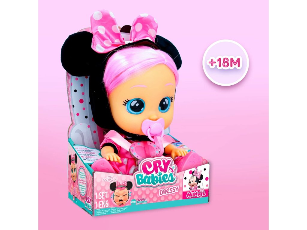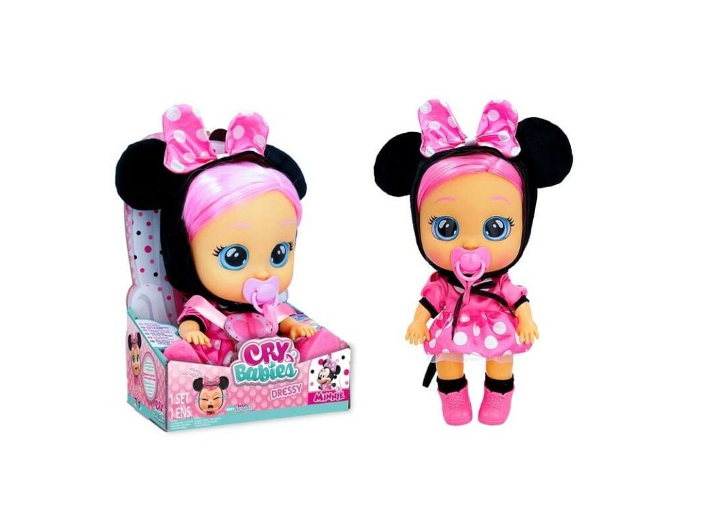 Cry Baby - Dressy Minnie je ideálna interaktívna bábika pre malé deti, ktoré sa chcú hrať a starať sa o svoje bábiky. Jej realistické funkcie plaču a detských zvukov, spolu s ohybnými končatinami, z nej robia skvelý doplnok do každej detskej izby.