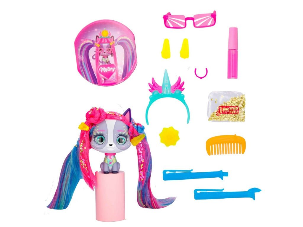 Set obsahuje 10 rôznych prekvapení a 8 unikátnych doplnkov na štylizáciu neonového účesu, ako sú módne slnečné okuliare, gumičky do vlasov, diadem, obojok, hrebeň a ďalšie.