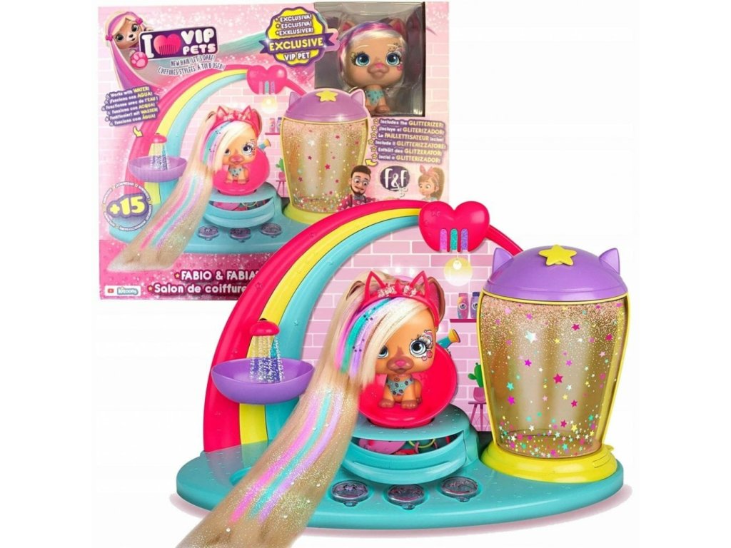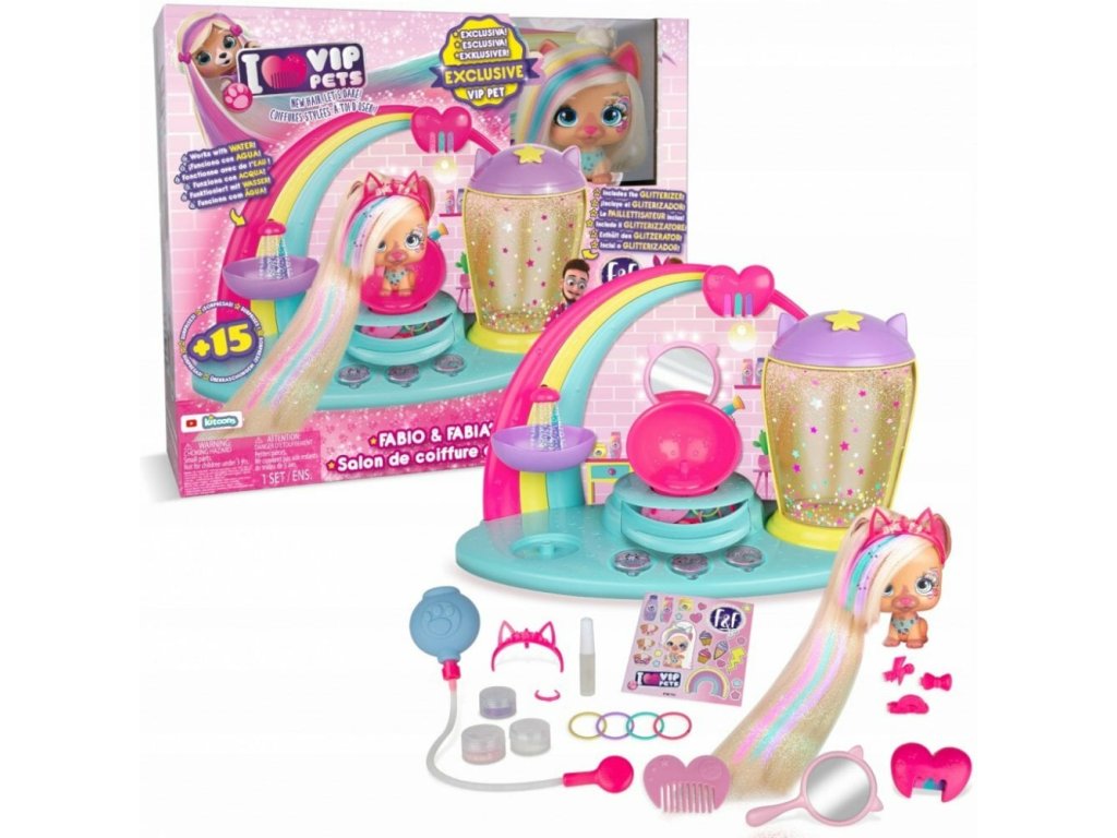 VIP Pets Fabio & Fabia - Hair Salon Playset je ideálny pre deti, ktoré milujú styling a módu. Táto súprava poskytuje hodiny kreatívnej zábavy a je skvelým darčekom pre malé kaderníčky.
