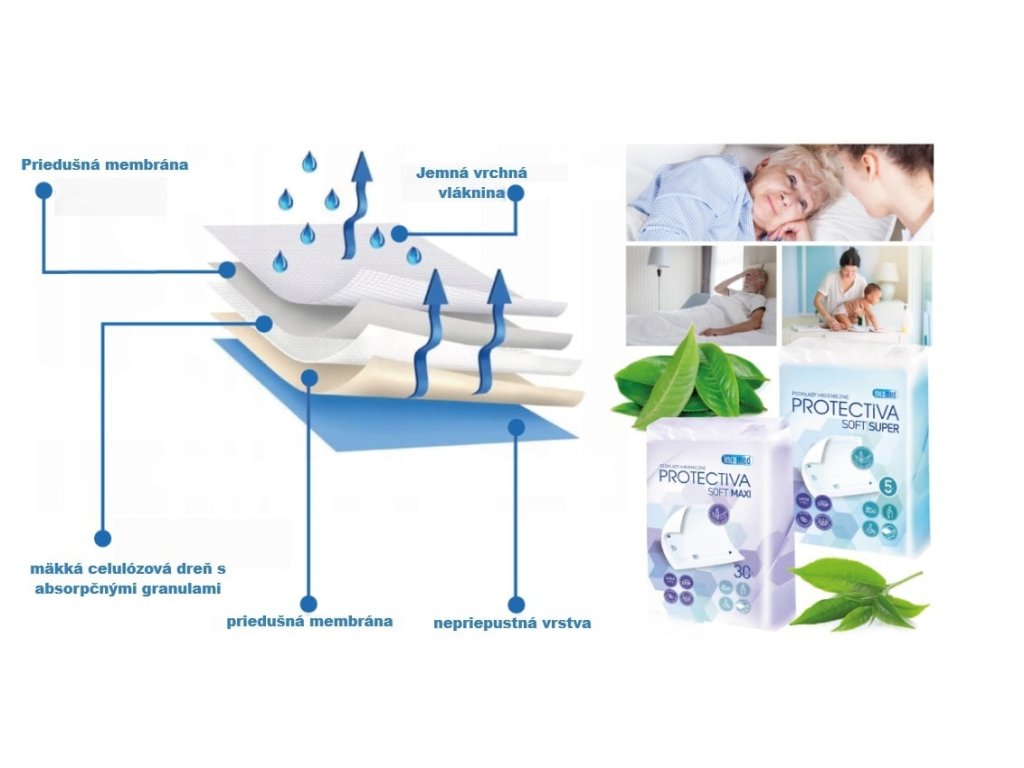 Podložky sú obohatené o superabsorbent s extraktom zo zeleného čaju, ktorý im dodáva antibakteriálne vlastnosti. Táto prémiová technológia poskytuje dodatočnú ochranu pred baktériami, čím zvyšuje hygienickú bezpečnosť a robí z tohto produktu jedného z lídrov vo svojej kategórii. Vďaka nepriepustnej spodnej vrstve podložky účinne chránia postele, matrace, posteľnú bielizeň, invalidné vozíky, stoličky a kreslá pred vlhkosťou a znečistením.