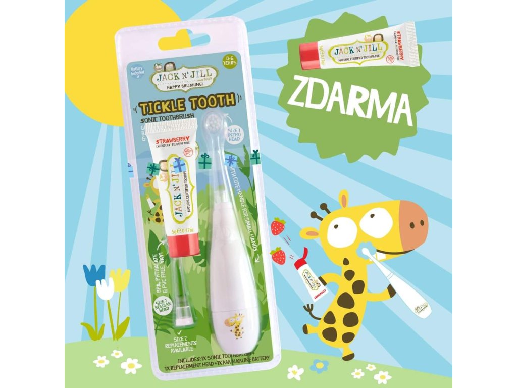 Sonická detská zubná kefka Jack N'Jill Tickle Tooth je ľahká a vhodná aj pre najmenšie deti už od prvého zúbka. Ideálny vek pre jej používanie je 0 - 6 rokov. Vďaka jemným vláknam čistí zúbky šetrne, no zároveň účinne. Pre deti je zábavnou pomôckou, pre rodičov zase praktickou – poskytuje väčšiu kontrolu nad kvalitou ústnej hygieny. Sonická technológia umožňuje nastavenie 30-sekundového intervalu, vďaka ktorému sa deti učia meniť pohyb kefky i miesto čistenia. Navyše, po 2 minútach sa automaticky vypne, čím predchádza zbytočnému vybíjaniu batérie. 👶 Roztomilá rukoväť pohodlne padne do malej ručičky. Sme si istí, že s touto kefkou si vaše dieťatko nebude chcieť prestať čistiť zúbky. K Sonickej detskej zubnej kefke Jack N'Jill Tickle Tooth odporúčame zakúpiť tieto produkty:- Náhradné hlavice na detskú sonickú zubnú kefku Jack N'Jill Tickle Tooth