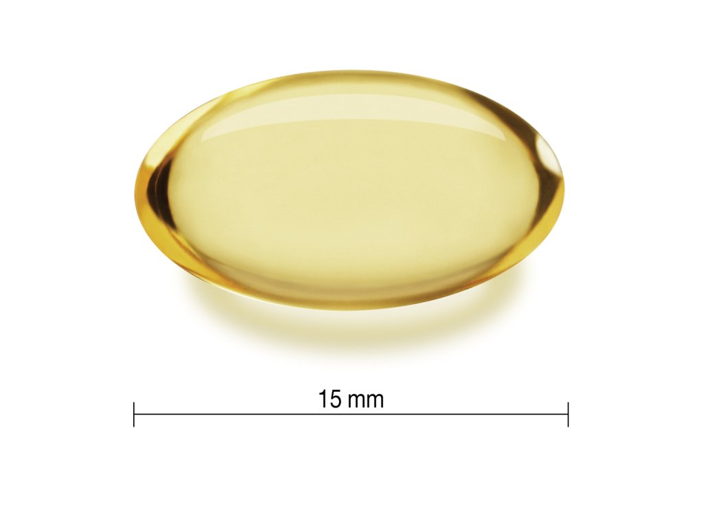 Ďalej obsahuje: sójový olej (bez GMO) (nosič), želatína (želírujúca látka), glycerol (povlaková látka)