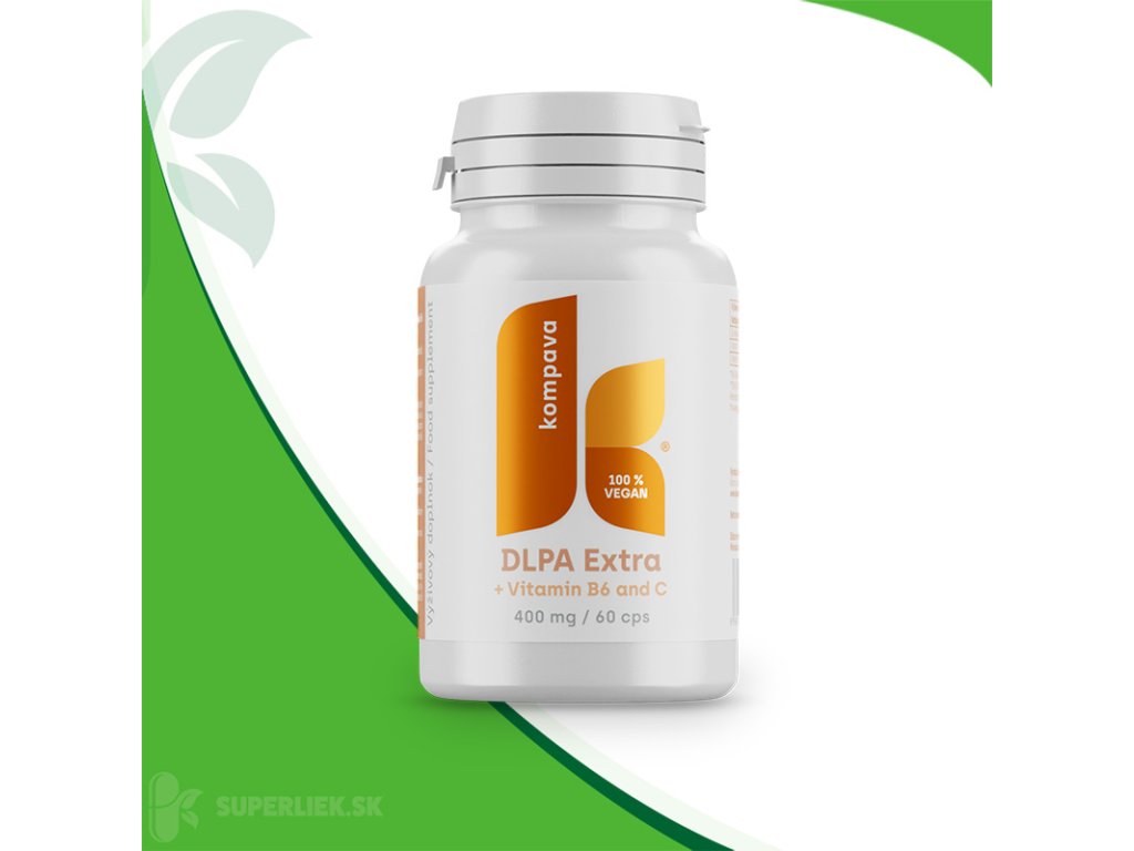 Výživový doplnok Kompava DLPA EXTRA obsahuje aminokyselinu fenylalanin (DL-phenylalanín), vitamín B6 a vitamín C.