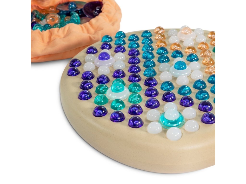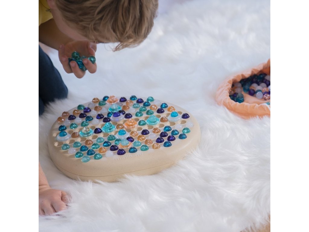 Táto hračka - mandala sa skladá z veľkého kameňa, na ktorom môžu deti vytvárať obrázky pomocou trblietavých guľôčok rôznych tvarov a farieb. Táto hra pripomína tradičnú, starú indickú činnosť maľovania mandál. Takáto činnosť má na bábätko veľmi dobrý vplyv.