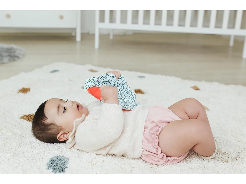 Sluch a hmat: Šuštiace prvky a rôzne textúry na okrajoch rozvíjajú sluchové a hmatové zručnosti a prinášajú deťom radosť z objavovania.