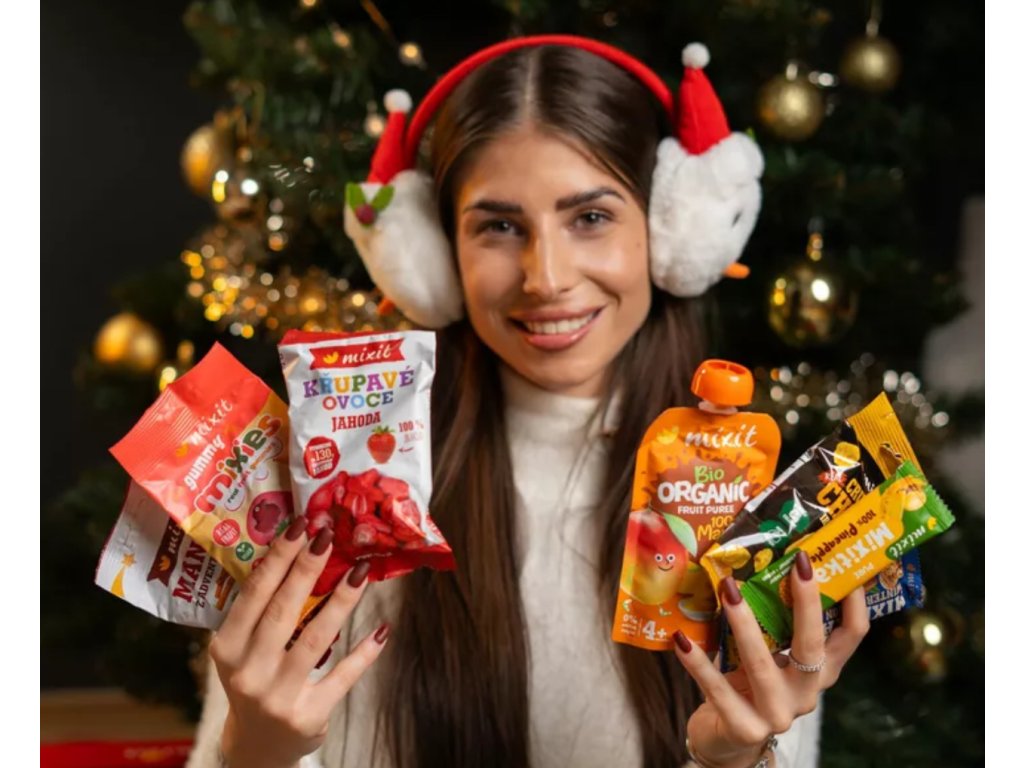 1x Mandle z adventných trhov do vrecka (60 g), 1x Ovocná Mixitka – 100 % Ananás (20 g), 1x Mixitka – Vianočná (45 g), 1x Ovocné Mixies - Jahoda & banán – prírodné želé cukríky (35 g), 1x Crème boule – Vanilla Date (30 g), 1x Crème boule – Cinnamon Chocolate (30 g), 1x Chrumkavé ovocie do vačku – Jahoda (13 g), 1x Mixit BIO ovocná kapsička – 100 % Mango (100 g), 1x Chrumkavý syr do vrecka – Írsky cheddar (20 g)