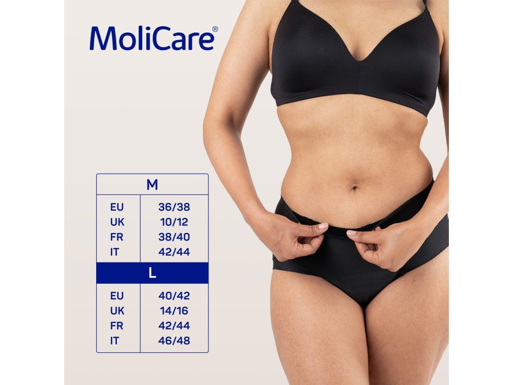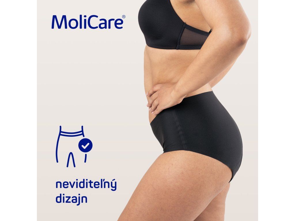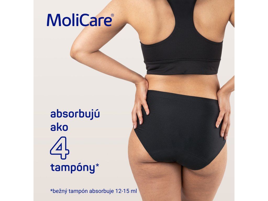 Vďaka designu na mieru ženskému telu je dámska spodná absorpčná bielizeň MoliCare určená pre ženy, ktoré trpia ľahkou inkontinenciou a hľadajú neviditeľné a udržateľné riešenie. Naviac sa hodia aj ako menštruačné nohavičky, pretože pojmú toľko tekutiny ako 4 bežné menštruačné tampóny.