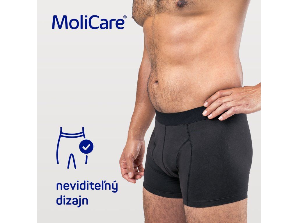 Vďaka designu na mieru mužskému telu je pánska absorpčná spodná bielizeň MoliCare určená pre mužov, ktorí trpia ľahkou inkontinenciou a hľadajú neviditeľné a udržateľné riešenie. Perte na 60 °C, aby ste eliminovali baktérie spôsobujúce zápach, a noste ako bežnú spodnú bielizeň. Absorpčná bielizeň MoliCare MEN je dermatologicky testovaná, certifikovaná Oeko-Tex 100 a je možné ju opakovane používať. Tieto inkontinenčné boxerky pre mužov boli navrhnuté v Nemecku a v porovnaní s bežnými jednorazovými inkontinenčnými výrobkami nevytvárajú žiadny odpad.