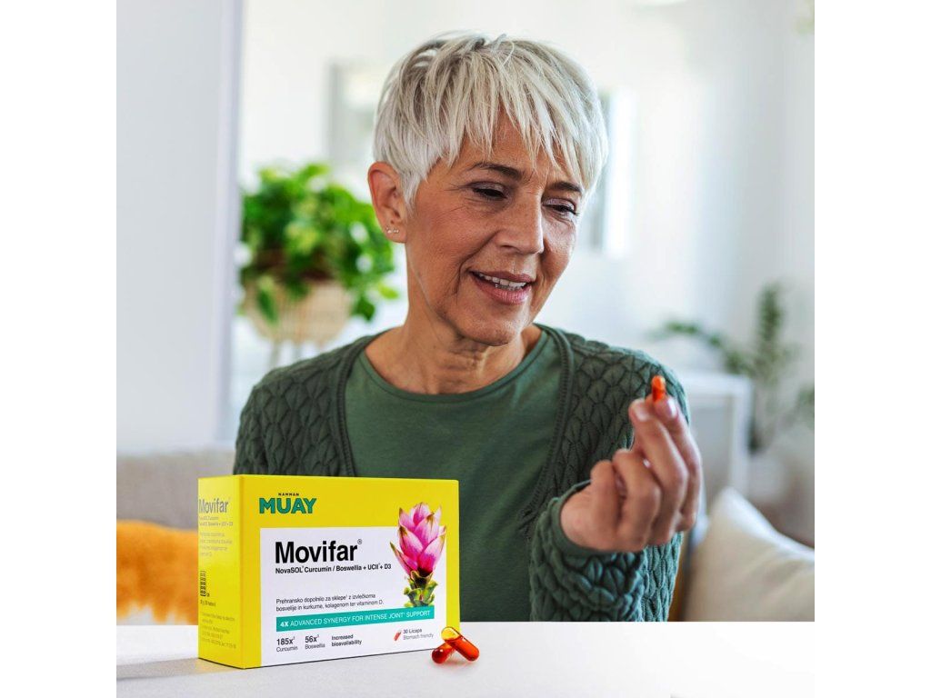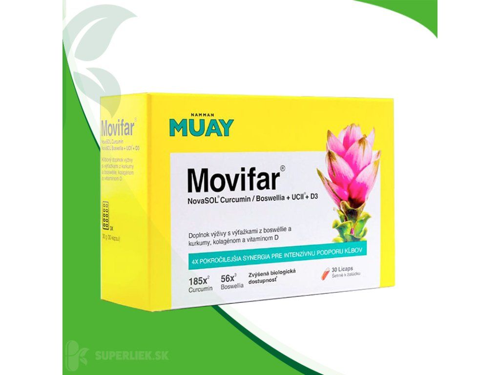 Vďaka pokročilej micelárnej technológii NovaSOL pre lepšiu biologickú dostupnosť výťažkov z boswellie a kurkumy a obsahu kolagénu UC-II, ktorý zachováva trojrozmernúštruktúru natívneho kolagénu, poskytuje Movifar optimálnu podporu pre vaše telo, aby si zachovalo svoju prirodzenú funkciu a odolnosť. Extrakty z boswellie a kurkumy prispievajú k udržaniu zdravých kĺbov a kostí. Vitamín D prispieva k udržaniu zdravých kostí a funkcie svalov a k normálnemu fungovaniu imunitného systému.