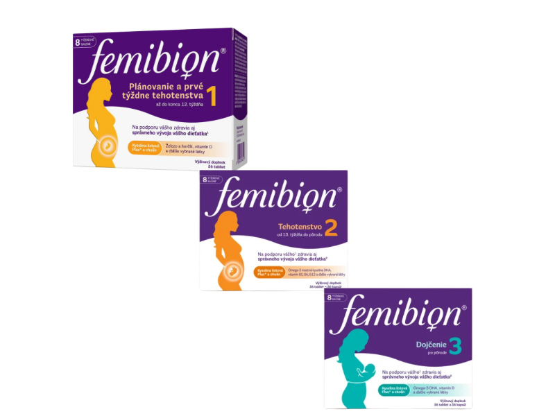 - Femibion 2 Tehotenstvo – komplex vitamínov a minerálov špeciálne pre tehotné (kyselina listová, cholín, vitamíny, minerály).