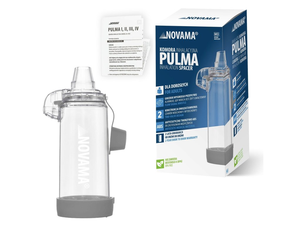 Komora uľahčuje koordináciu dýchania, čo maximalizuje úžitok z inhalovaného lieku. Vďaka mnohým výhodám, ako je píšťalka s vysokým prietokom, indikátor prietoku a antistatická materiálová konštrukcia, Novama Pulma uľahčuje správnu terapiu a zabraňuje strate lieku. Jej mäkký adaptér sa prispôsobí akémukoľvek tlakovému inhalátoru, čím zaručuje efektívnu prevádzku bez ohľadu na liek.
