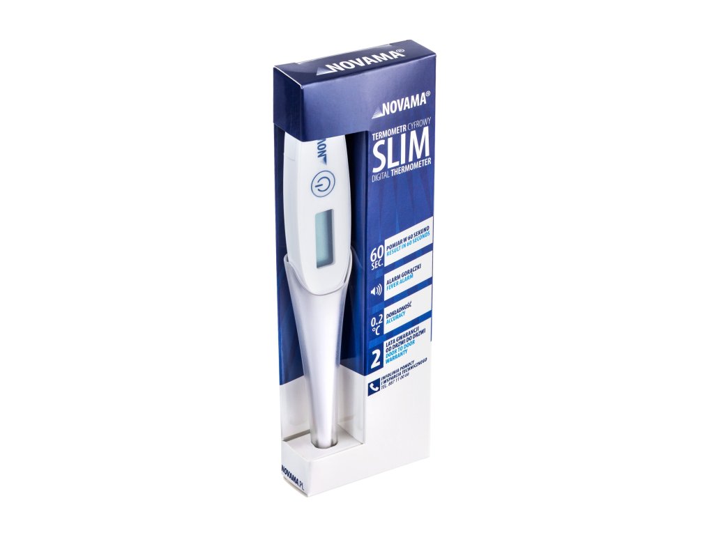 NOVAMA SLIM je moderný digitálny teplomer, ktorý vďaka svojim funkciám a presnosti predstavuje spoľahlivého pomocníka pre každú domácnosť. S rýchlym meraním, alarmom horúčky a jednoduchým ovládaním je ideálny pre všetky vekové kategórie.