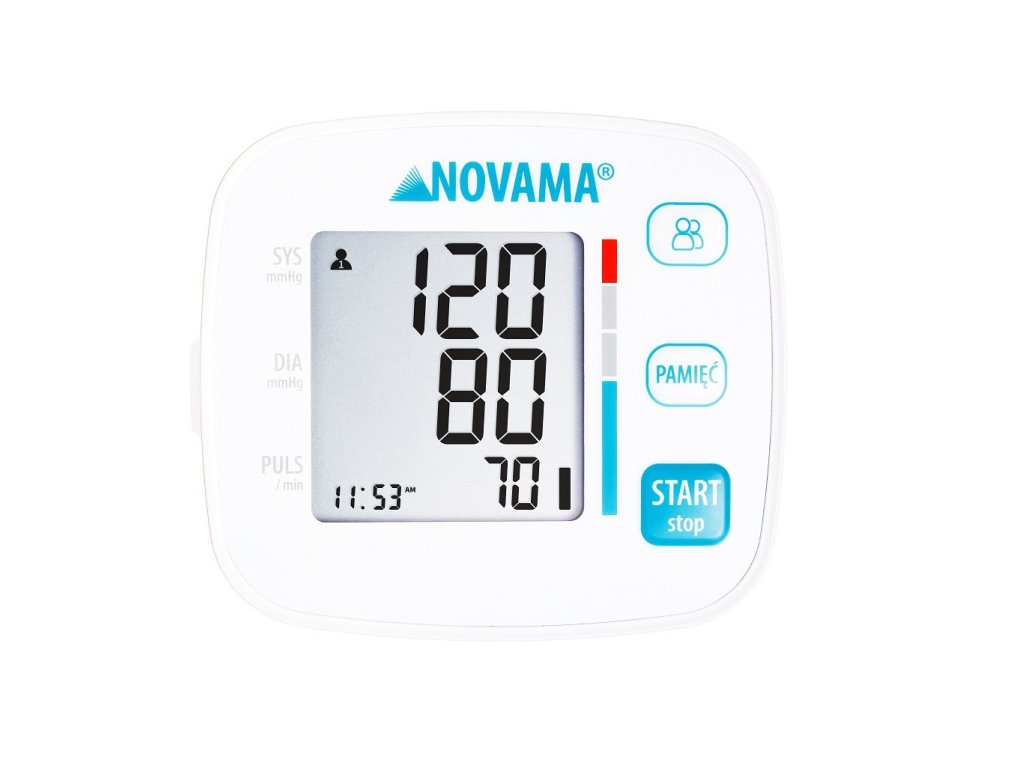 NOVAMA WHITE V je zápästný tlakomer novej generácie, ktorý ponúka funkcie a vlastnosti predstihujúce štandardy pri zachovaní prívetivej ceny - takže výber tlakomeru zostáva jednoduchý. Tento model je vybavený najnovšími technológiami, ktoré skracujú čas merania a eliminujú chyby, ako je meranie pri nafukovaní a detekcia pohybu počas merania.