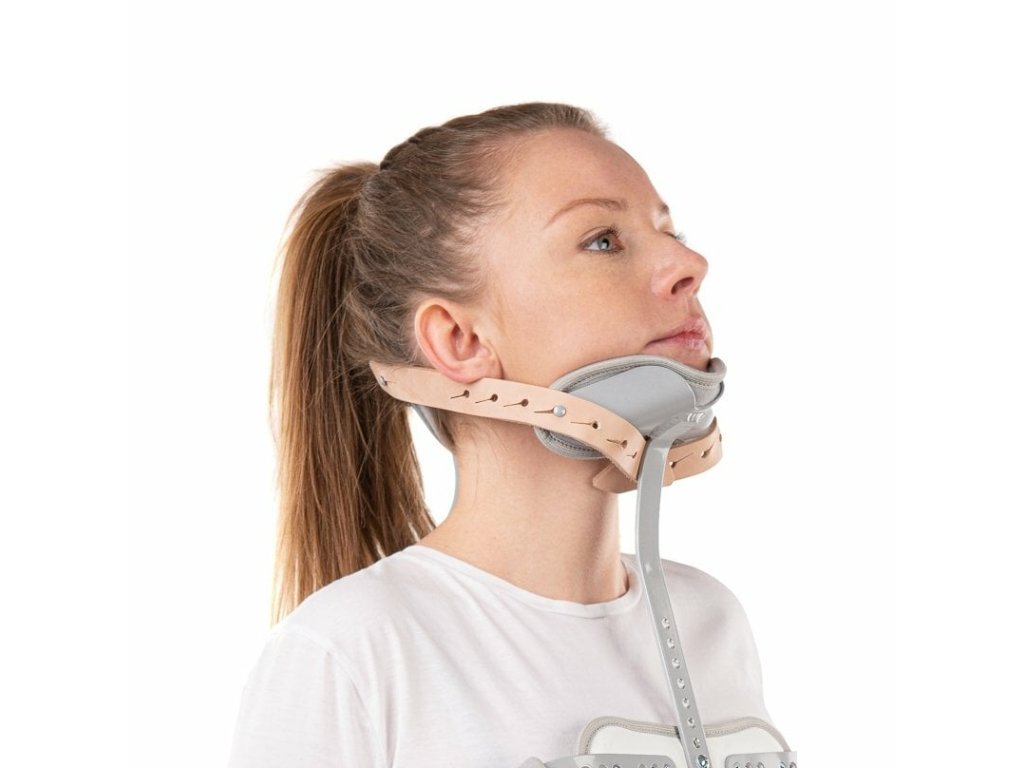 -ortéza pozostáva z podpery zátylku a podpery dolnej čeľuste, ktoré sú navzájom spojené koženými remienkami,