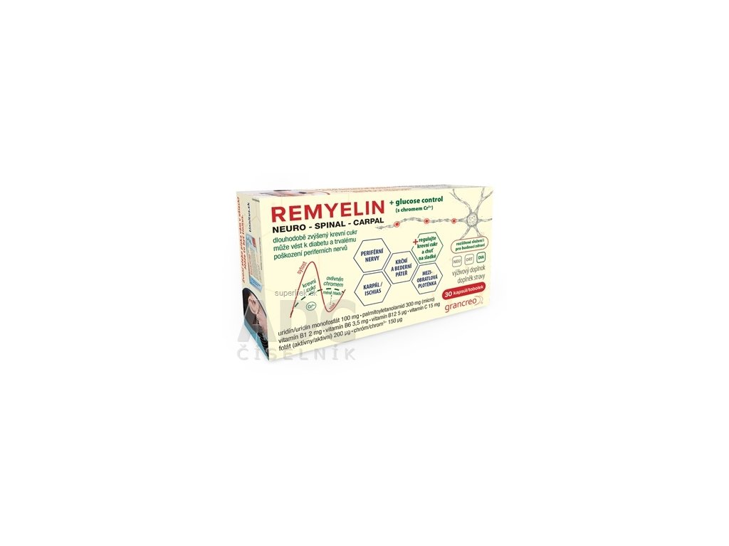 REMYELIN je vhodný ako výživový doplnok pre ľudí s nedostatkom vitamínov sk. B, ktoré sa môžu prejavovať nesprávnou funkciou nervov a následnými problémami napr. s karpálom, chrbta, krížov, sedacím nervom, medzistavcových platničiek a pod. Nie len vďaka vitamínom B1, B6, B12 a kyseliny listovej (folát) môže významne prispieť k normálnej funkcii nervov. Chróm prispieva k normálnej hladine krvného cukru. Dlhodobo zvýšená hladina krvného cukru môže viesť napr. k trvalému poškodeniu periférnych nervov, osobitne u ľudí s cukrovkou.