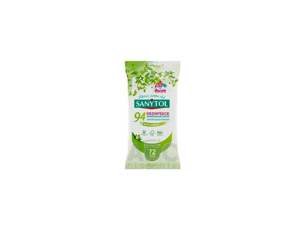 Sanytol jednorazové čistiace dezinfekčné utierky, s 94% rastlinného pôvodu. Na všetky materiály a plochy.