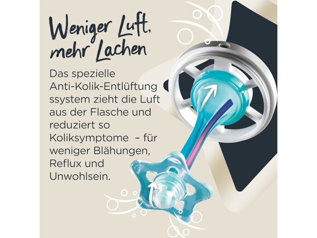 Hlavným prvkom fľaše je trojdielny antikolikový systém, ktorý sa skladá z ventilového ventilu, rúrky a tepelného snímača. Tento systém funguje tak, že ventil v cumlíku odvádza vzduch do rúrky, kde prechádza cez mlieko, čím znižuje tvorbu vzduchových bublín. To pomáha minimalizovať prehltnutie vzduchu počas kŕmenia, čo je často príčinou kolík.