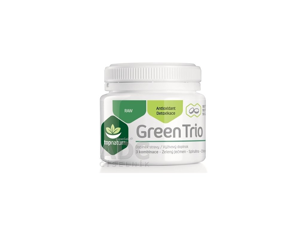 Výživový doplnok Green trio v tabletách. Obsah: spirulina (Arthrospira platensis), chlorela (Chlorella pyrenoidosa), zelený jačmeň (Hordeum vulgare). Balenie v dávke na mesiac. Viac o produkte na adc.sk