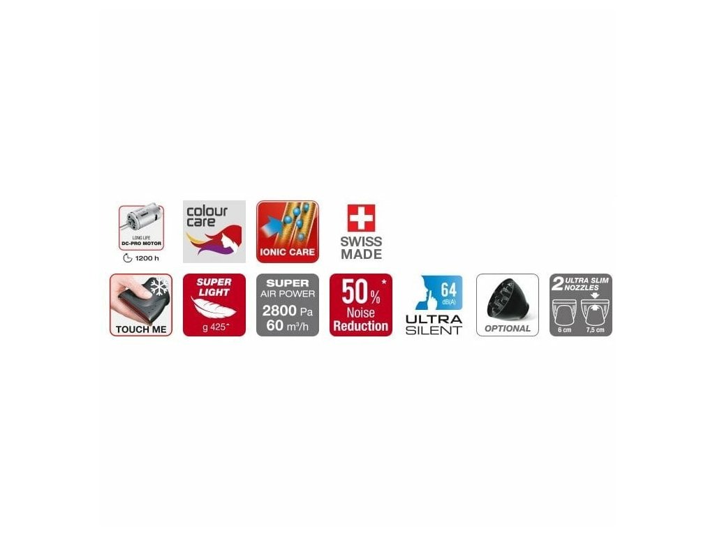 Perfektné príslušenstvo pre sušič Swiss Silent 6500 Light Ionic.Tento vynikajúci sušič vlasov má motor s dlhou životnosťou DC-PRO, ktorý je mimoriadne odolný. Sušič má navyše profesionálny rotačný kábel RotoCord, vďaka čomu je práca s týmto prístrojom veľmi pohodlná. Sušič pracuje veľmi ticho, pretože je vybavený funkciou potlačenia hluku o 50%. Ionizácia a tlačidlo studeného vzduchu spôsobia, že vaše vlasy budú omnoho hladšie a lesklejšie. Na druhej strane 6 nastavení prúdenia vzduchu a teploty vám umožní prispôsobiť sušič typu a stavu vašich vlasov.
