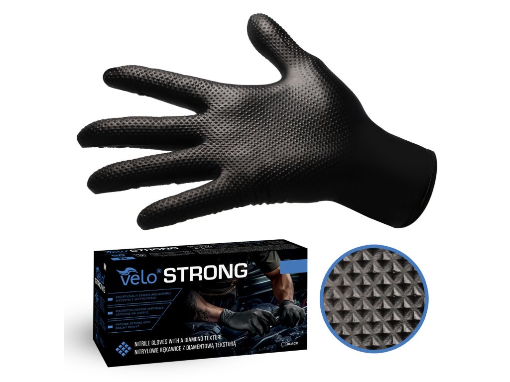 VELO STRONG GRIP sú extrémne odolné rukavice s unikátnou diamantovou textúrou, ktorá zaisťuje výnimočne pevný úchop. Sú navrhnuté na „špeciálne úlohy“, ako sú opravy automobilov, čistenie priemyselných strojov, presné laboratórne práce alebo záhradníctvo.