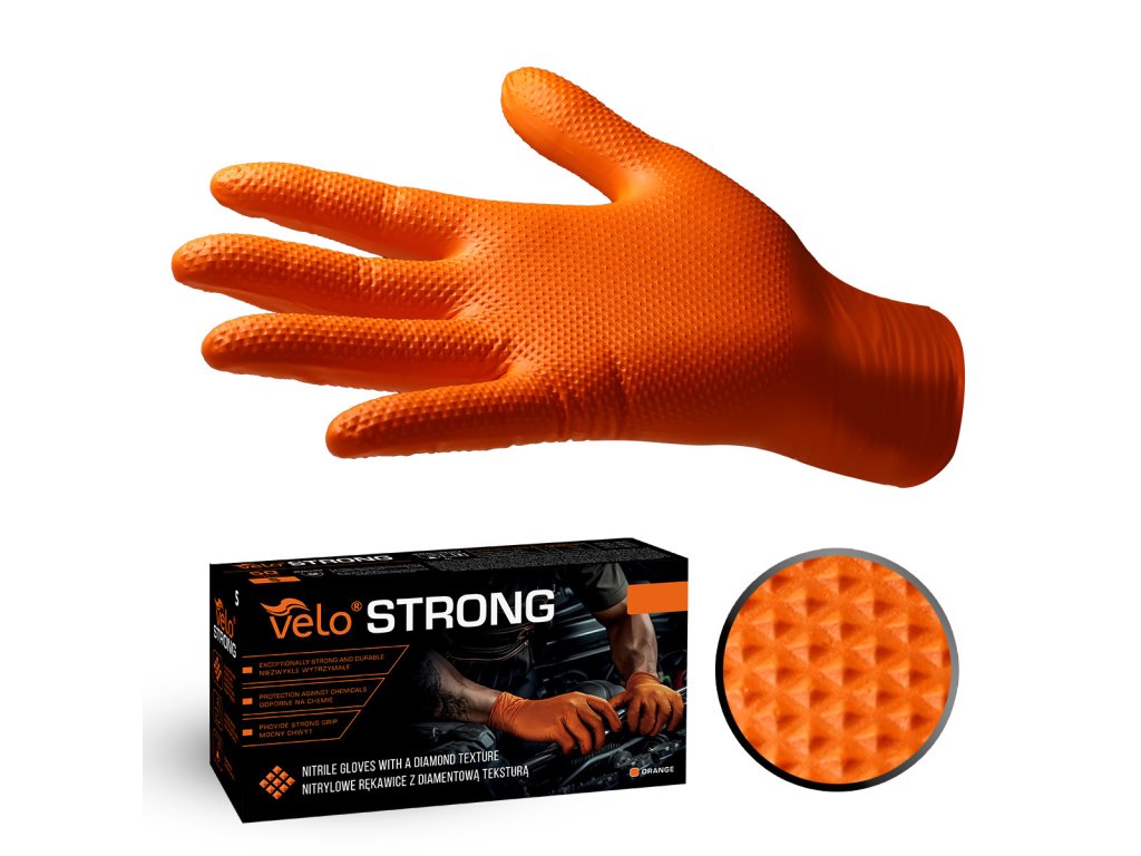 VELO STRONG GRIP sú extrémne odolné rukavice s unikátnou diamantovou textúrou, ktorá zaisťuje výnimočne pevný úchop. Sú navrhnuté na „špeciálne úlohy“, ako sú opravy automobilov, čistenie priemyselných strojov, presné laboratórne práce alebo záhradníctvo.