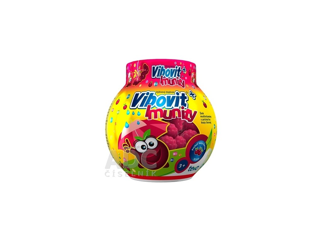 Vibovit+ Imunity - želé multivitamíny pre deti, obsahujú komplex 10 vitamínov a minerálnych látok na podporu zdravej imunity detí nielen v sychravom počasí. So zvýšeným obsahom vitamínu D a C, s prírodnými farbivami a arómou. Vitamíny D, C, B6, B12, zinok a selén podporujú normálne fungovanie imunitného systému. Zinok podporuje normálny stav zraku. Vitamín D prispieva k udržaniu normálneho stavu kostí a zubov. Vitamín B6, biotín a niacín ešte podporujú normálnu činnosť nervovej sústavy. Selén prispieva k normálnej činnosti štítnej žľazy.