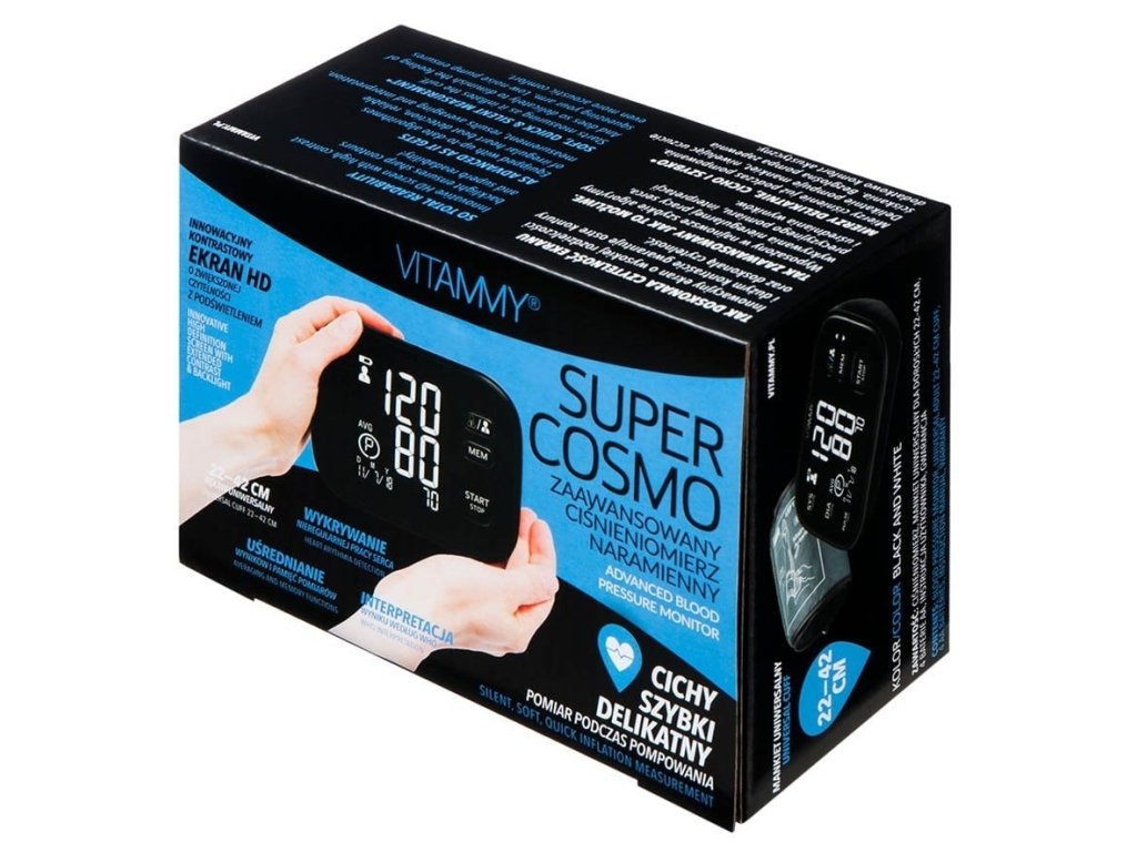 VITAMMY SUPER COSMO využíva najnovšie rýchle algoritmy pre presné meranie krvného tlaku a detekciu nepravidelného srdcového tepu (arytmie). Tento digitálny tlakomer na rameno meria tlak už počas nafukovania manžety, čím minimalizuje nepríjemný pocit stláčania a skracuje čas merania. V prípade zistenia nepravidelného pulzu vás na to tlakomer upozorní, čo vám môže pomôcť včas konzultovať váš zdravotný stav s lekárom.