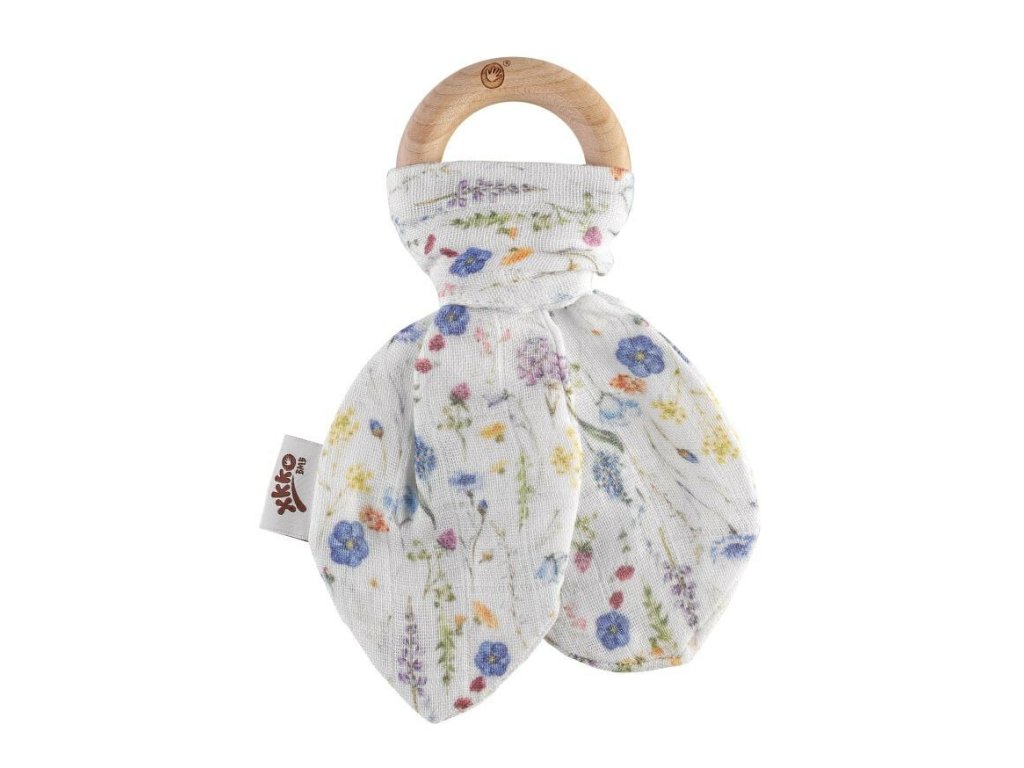 Drevené hryzátko XKKO BMB so šuštivými lístkami z extrémne jemného bambusového mušelínu. Bambusová viskóza je antibakteriálna a nespôsobuje žiadnu alergickú reakciu.