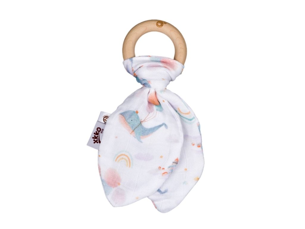 Drevené hryzátko XKKO BMB so šuštivými lístkami z extrémne jemného bambusového mušelínu. Bambusová viskóza je antibakteriálna a nespôsobuje žiadnu alergickú reakciu.