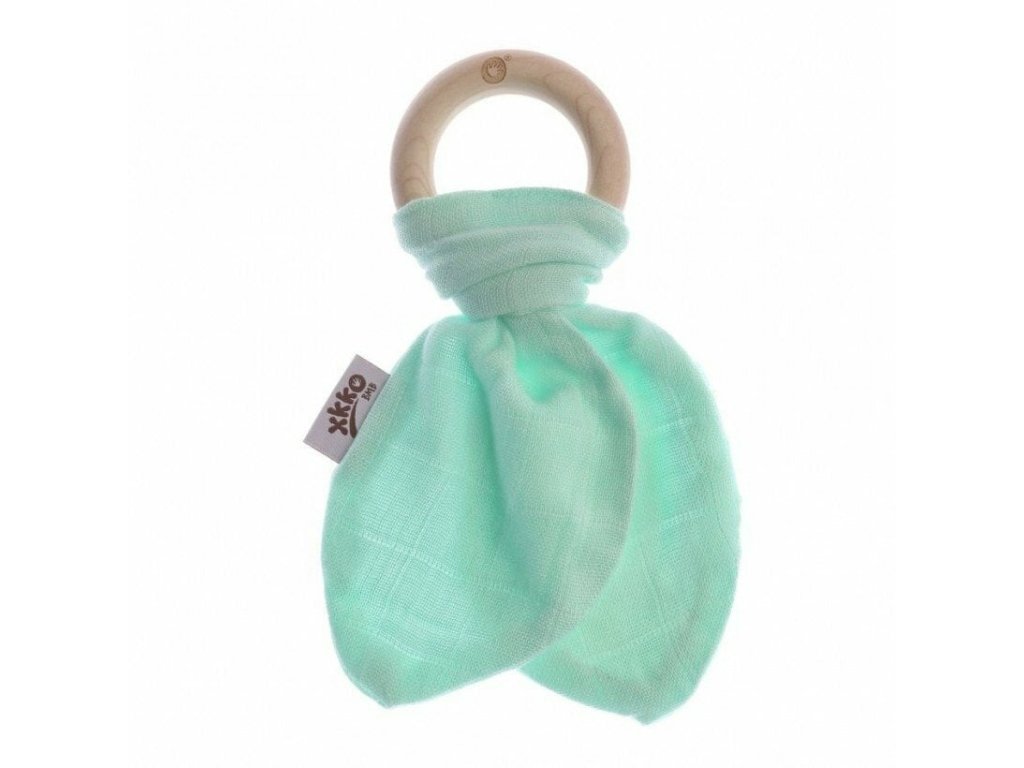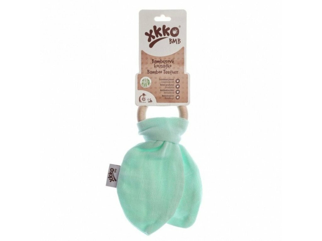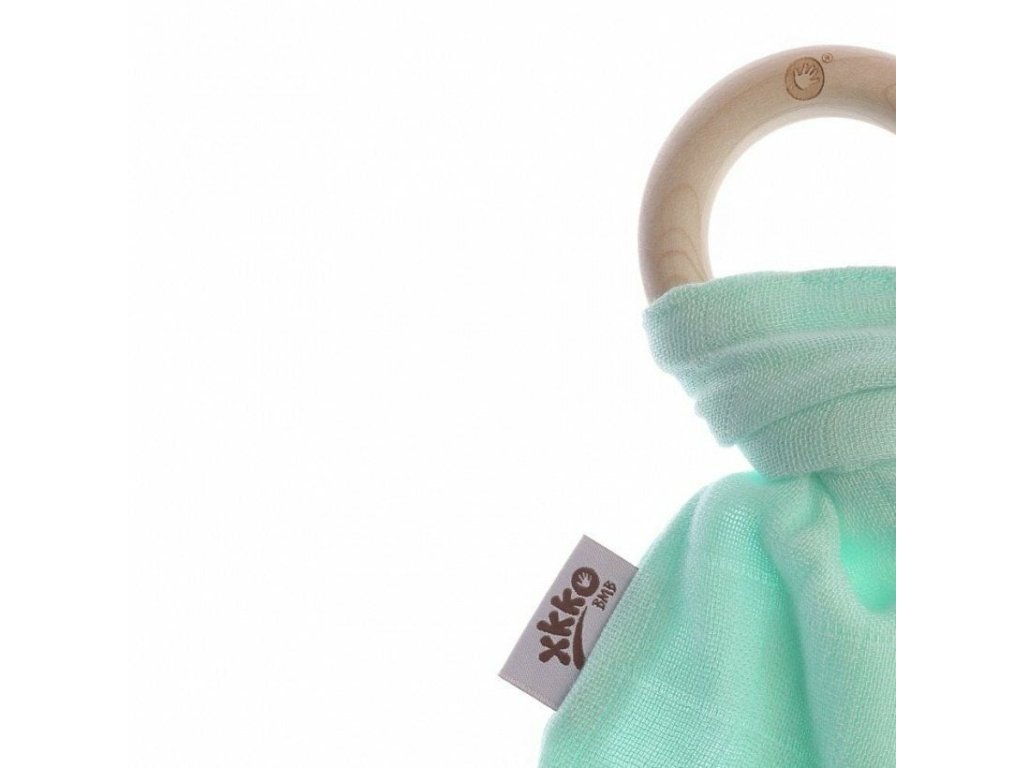 Drevené hryzátko XKKO BMB so šuštivými lístkami z extrémne jemného bambusového mušelínu. Bambusová viskóza je antibakteriálna a nespôsobuje žiadnu alergickú reakciu.